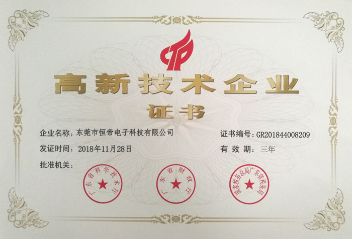 近日,經(jīng)國家科技部、財政部、國家稅務(wù)總局專家評審,東莞市恒帝電子科技有限公司獲得了由廣東省科技廳、財政廳、省國稅局、省地稅局聯(lián)合頒發(fā)的《高新技術(shù)企業(yè)》證書,這標(biāo)志著我司成為國家高新技術(shù)企業(yè)的一員。